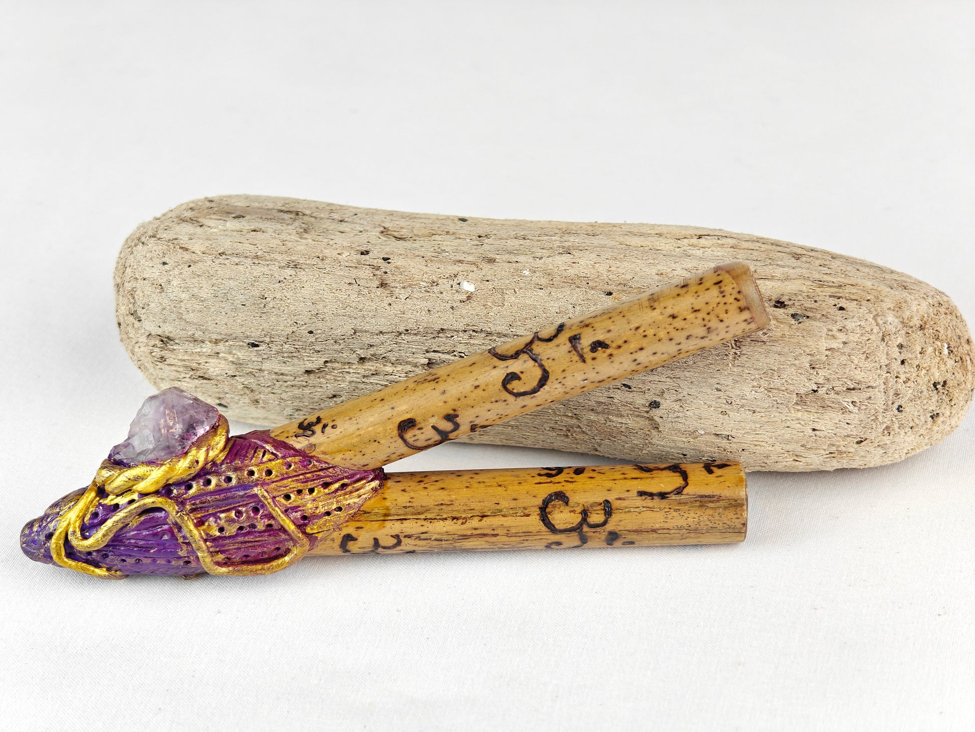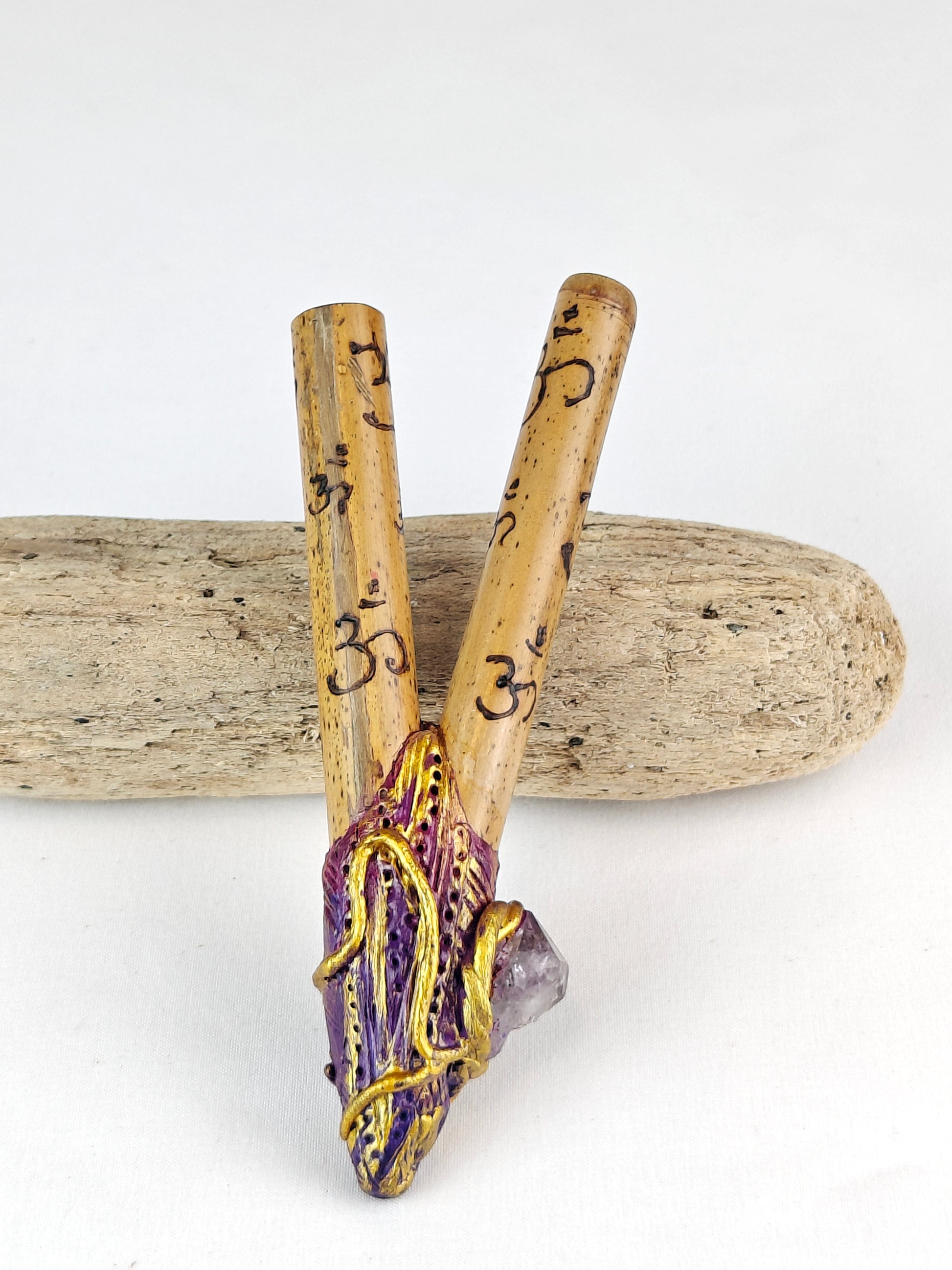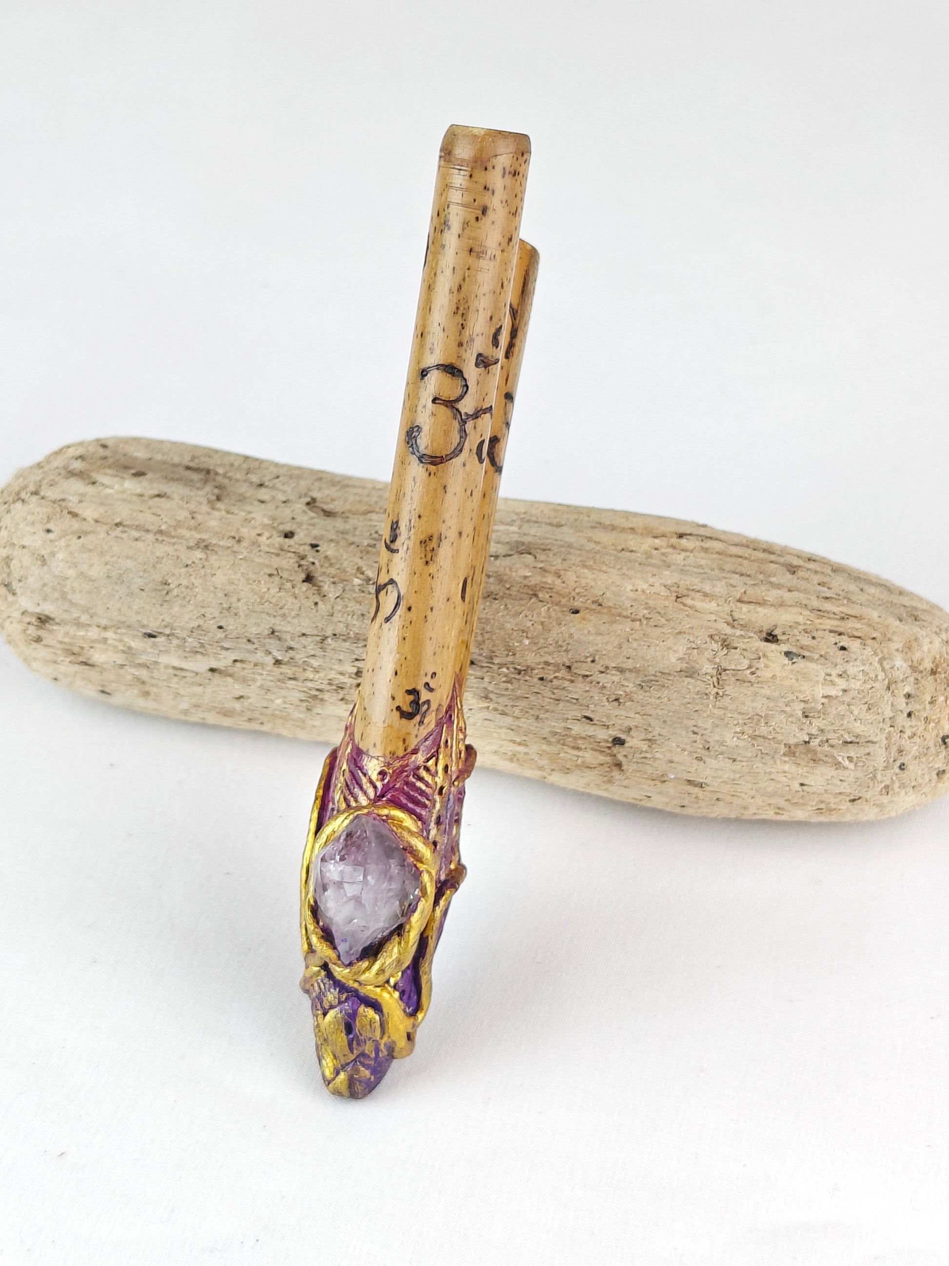 A self-applicator hand-carved and made with high-quality bamboo studded with amethyst, which has the strong power of healing and purification and of developing your spiritual intention. It is very powerful for protection and support against addictions and various spiritual blocks. It calms fears, increases hope, and lifts the spirit.